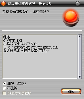 微点主动防御软件在发现该病毒后将报警提示您发现“未知间谍软件”,请直接选择删除处理(如图1);