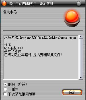 如果您已经将微点主动防御软件升级到最新版本,微点将报警提示您发现"Trojan-PSW.Win32.OnLineGames.cqvx”,请直接选择删除(如图2)。