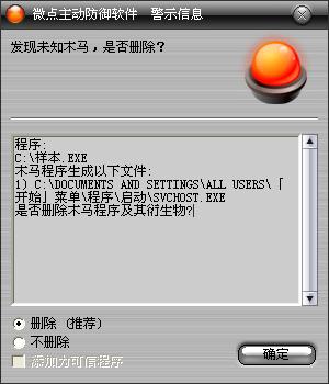 微点主动防御软件在发现该病毒后将报警提示您发现“未知木马”,请直接选择删除处理(如图1);