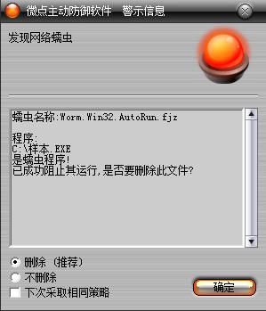 如果您已经将微点主动防御软件升级到最新版本,微点将报警提示您发现"Worm.Win32.AutoRun.fjz”,请直接选择删除(如图2)。