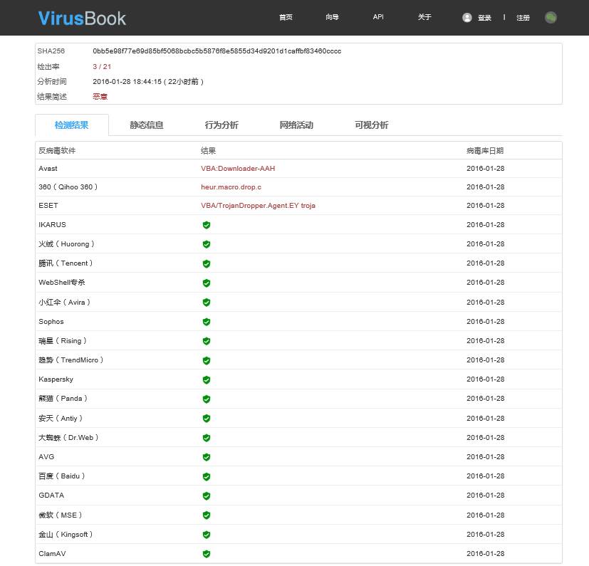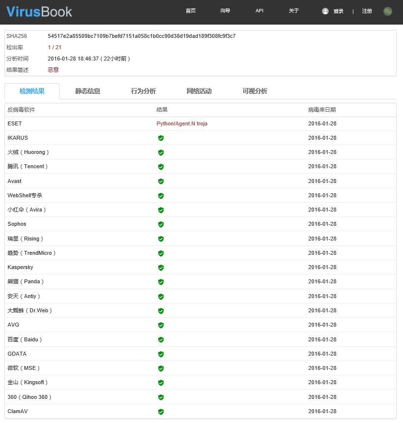 (VirusBook链接: https://www.virusbook.cn/view_report/scan/54517e2a85509bc7109b7befd7151a058c1b0cc90d38d19dad189f308fc9f3c7-1453977997975)